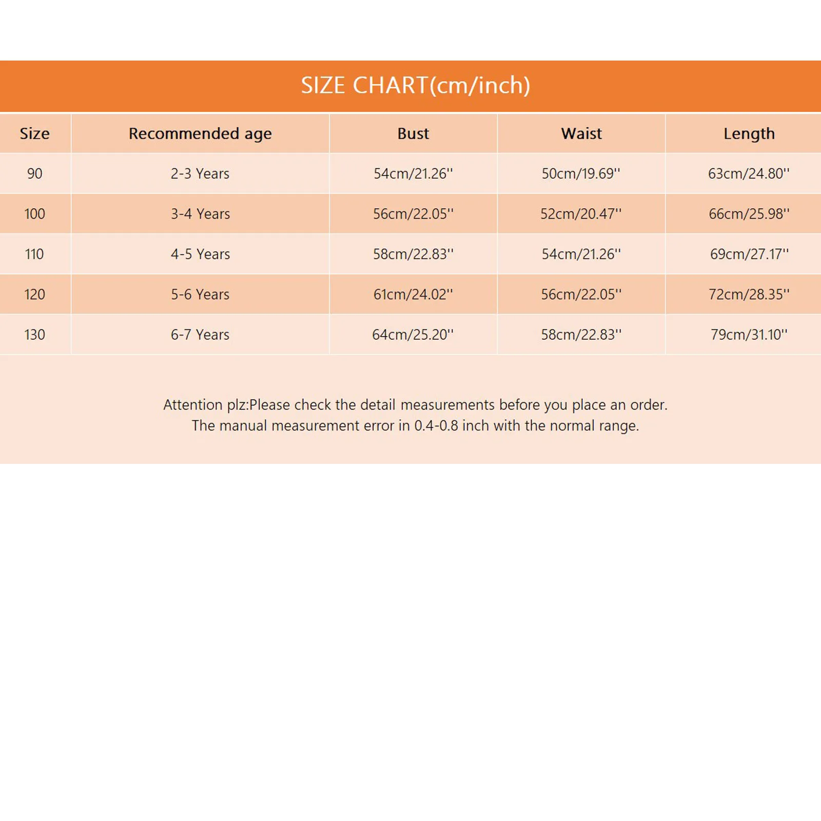| Size:130 | Recommended age:6-7 Years | Bust:64cm/25.20” | Waist:58cm/22.83” | Length:79cm/31.10” |
